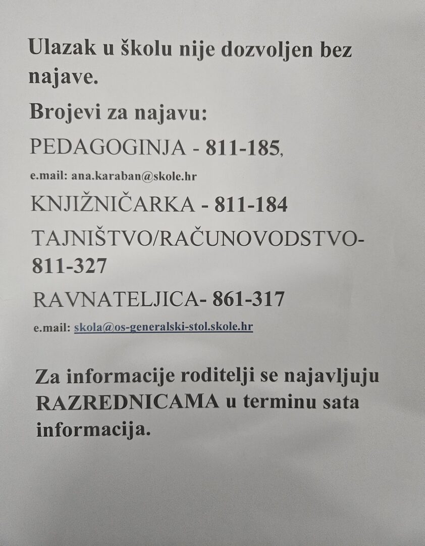 u privitku se nalaze Upute o kontroli ulaska i izlaska u OŠ Generalski Stol i kontakti za najavu ulaska u Školu.